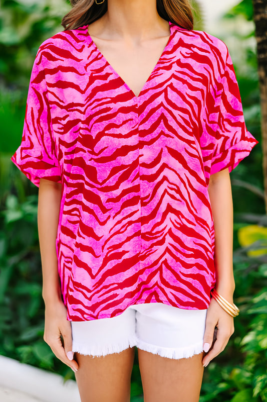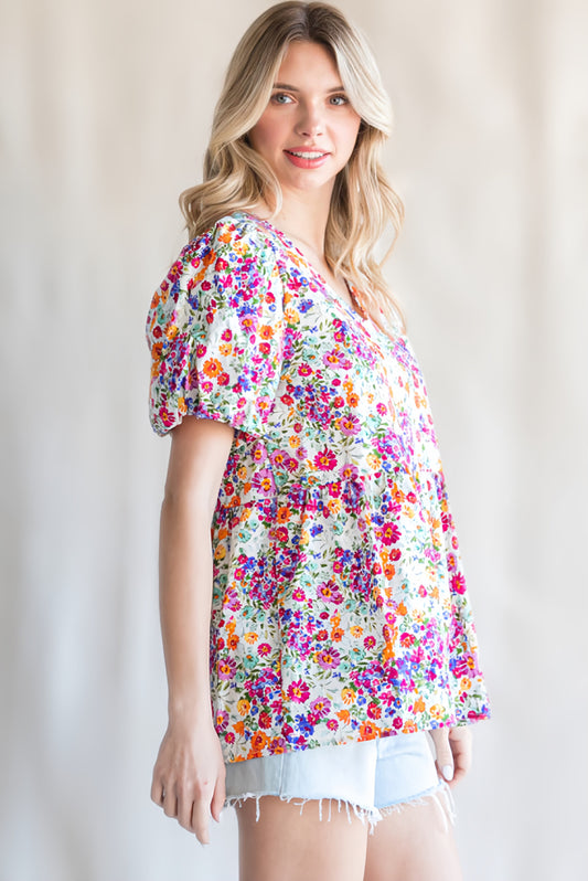 The Pink Brushstroke Puff Sleeve Button Back Top