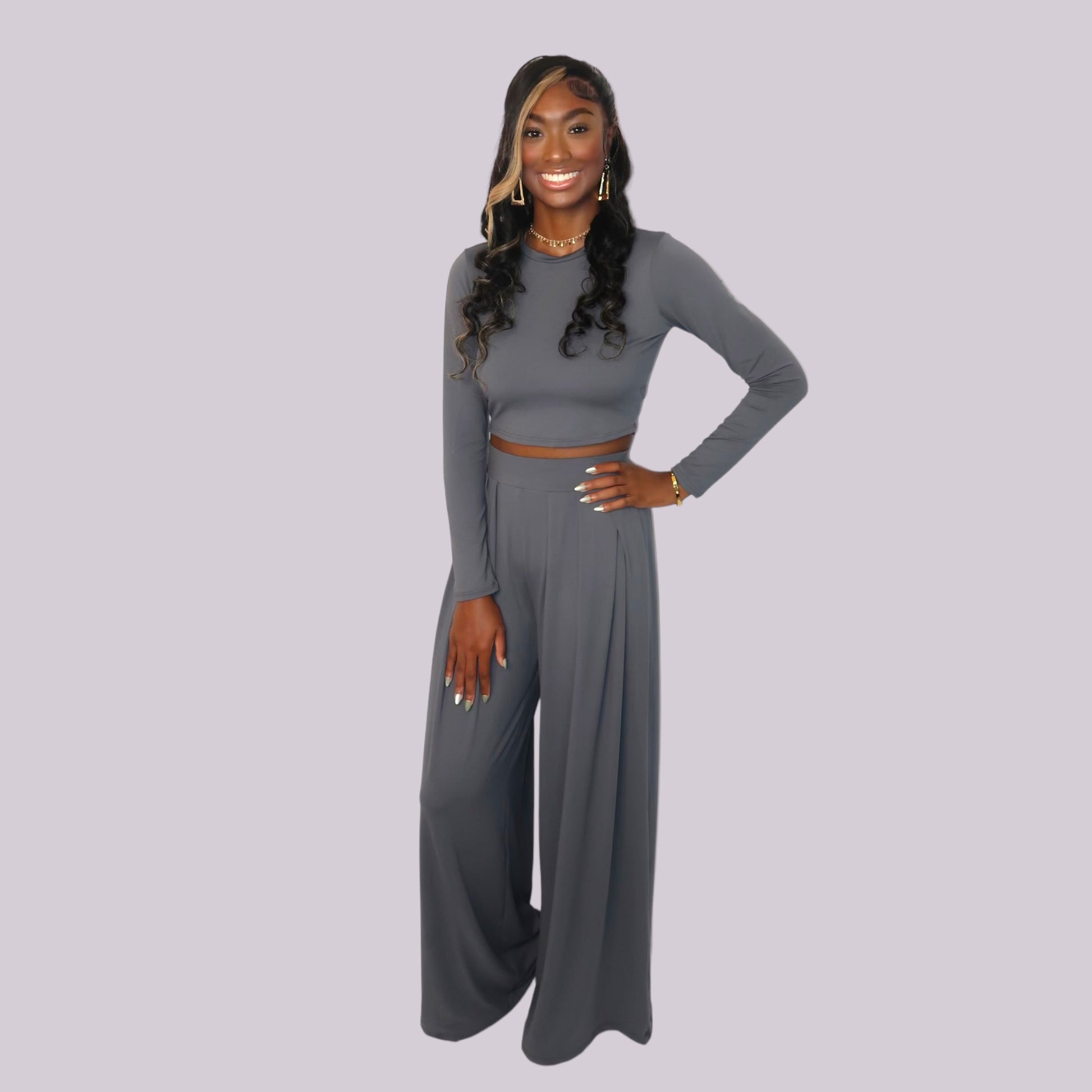 This stylish set features casual elegancy, ensuring you look your best without sacrificing comfort. The pleated wide-leg pants provide a flattering silhouette while the long-sleeve top adds an elegant touch. The classic charcoal ensures the perfect finishing touch for a sophisticated look!