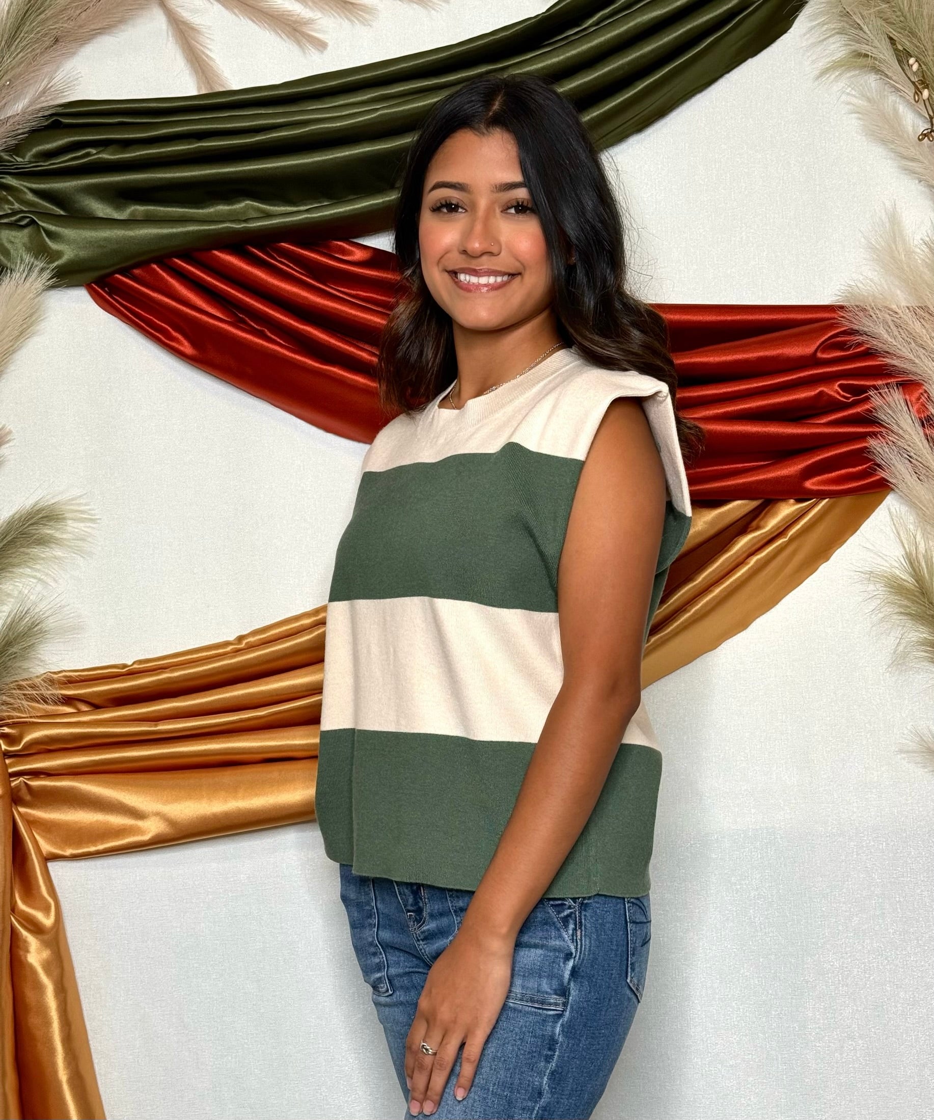- Oatmeal/olive wide striped bodice