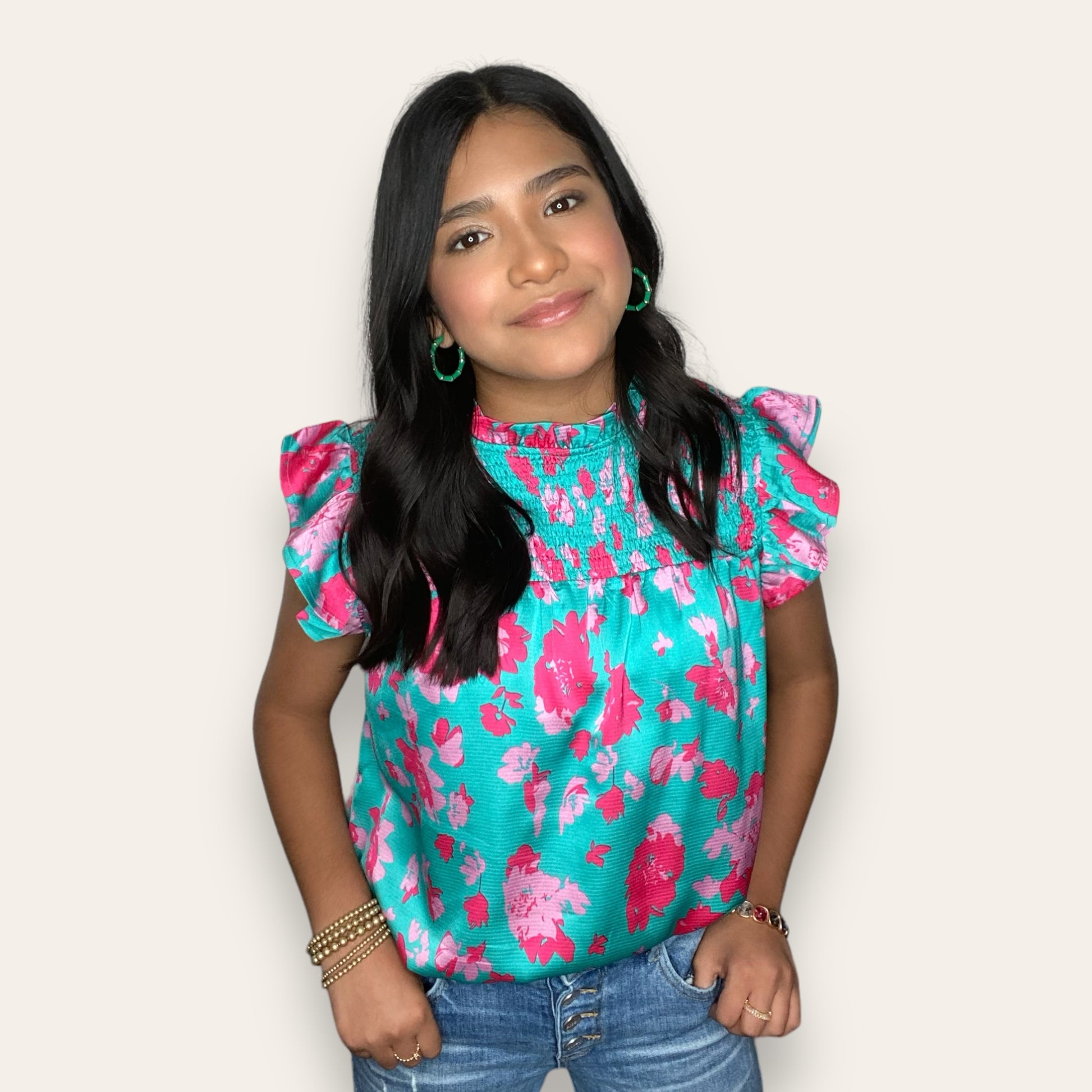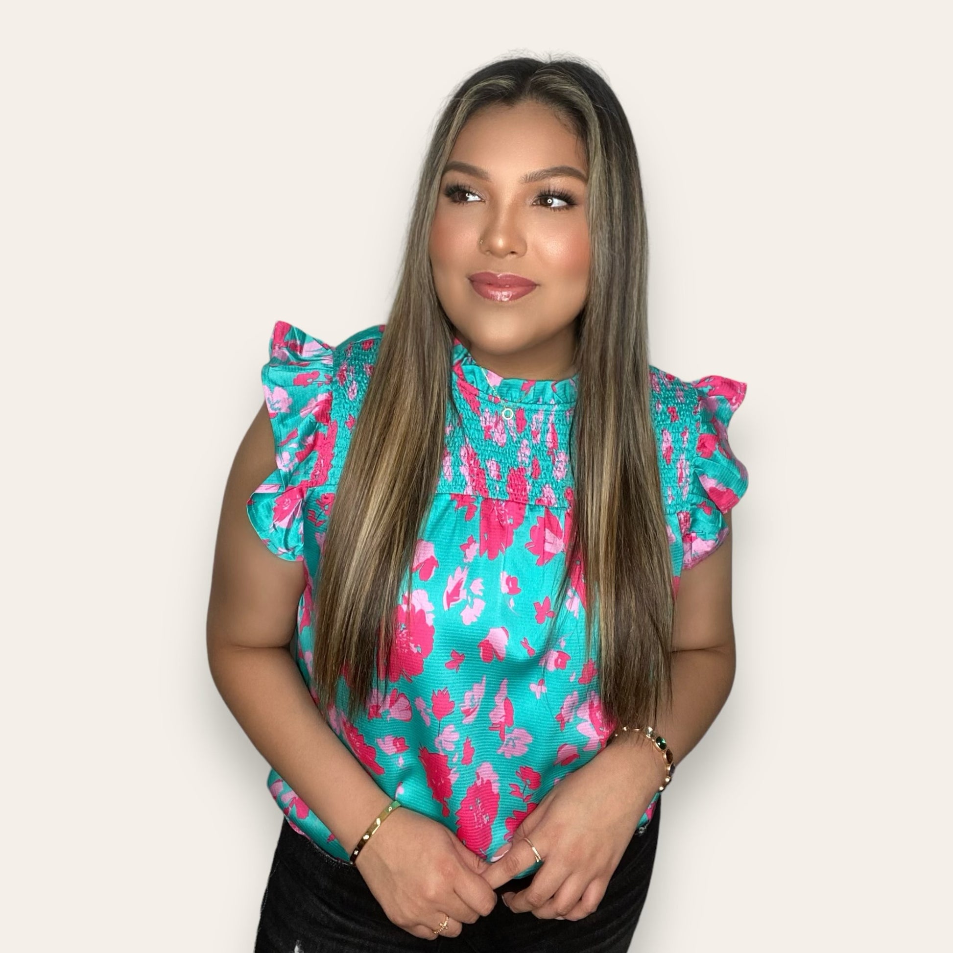 Elevate your wardrobe with the stunning Anastacia Floral Flutter Sleeve Blouse. Its vibrant green color and delicate pink flowers will make you stand out in any crowd. The lightweight flutter sleeves add an elegant touch, making it perfect for both casual and formal occasions. Make a statement and exude confidence in this beautiful blouse!