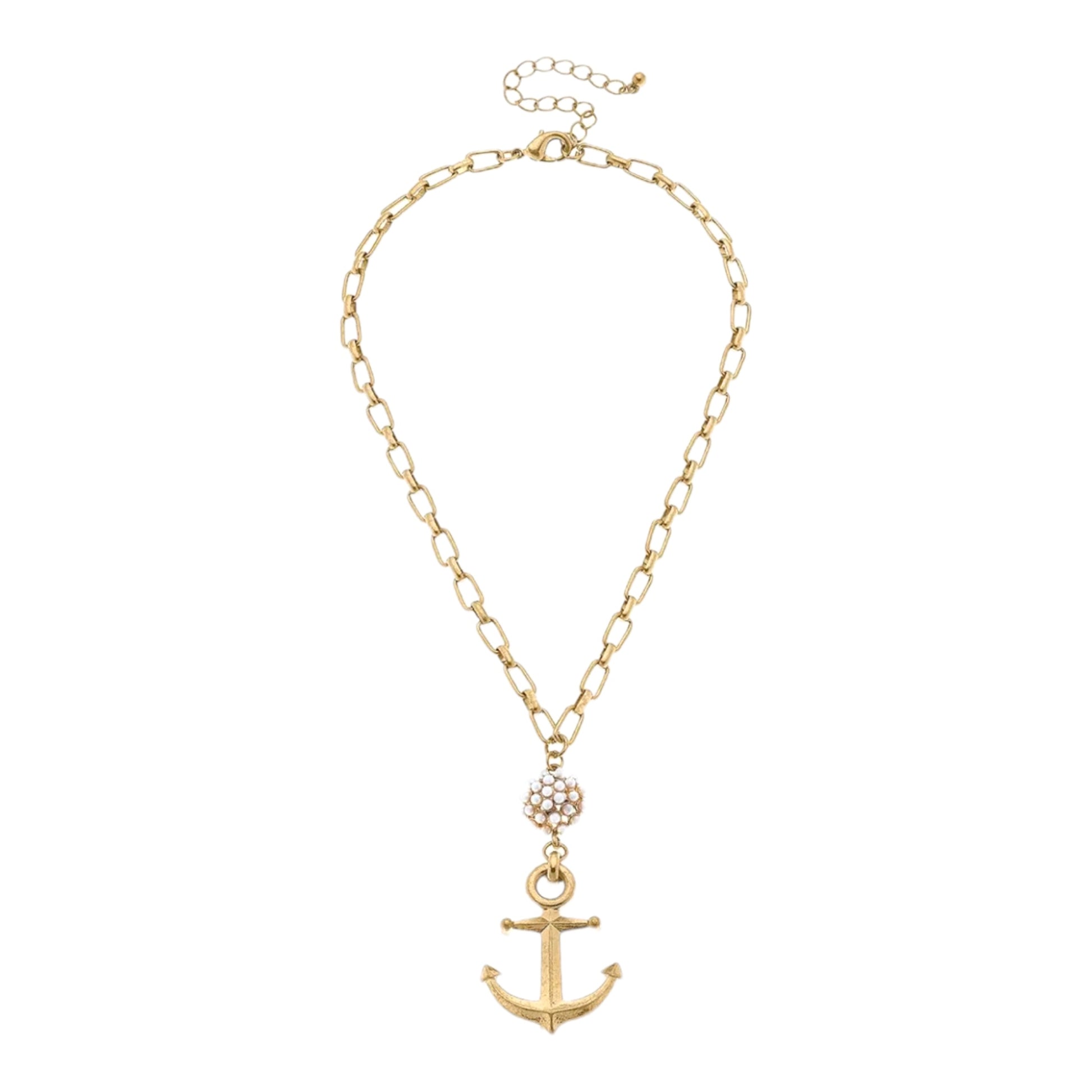 Unleash your inner sea goddess with The Anchor And Pearl Cluster Pendant Necklace. This stunning necklace boasts a beautifully delicate anchor pendant and lustrous cluster of pearls in worn gold. Perfect for adding a touch of nautical charm to any outfit. Dive into style with this must-have accessory!