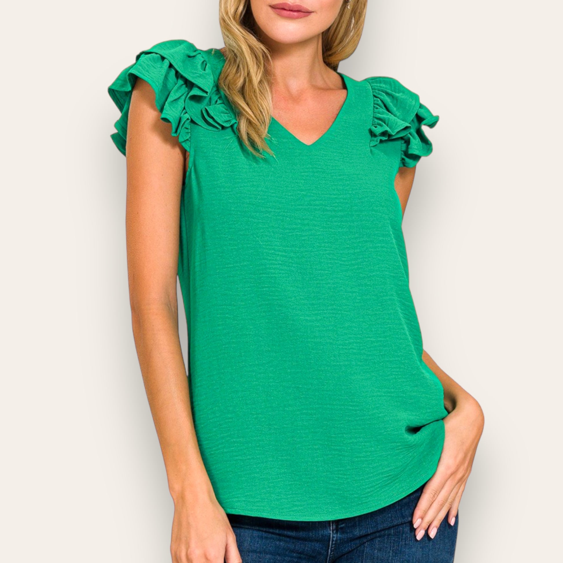 Add a pop of color to your wardrobe with the Ariella Tiered Ruffle Sleeve Top. This beautiful kelly green color will make you stand out, while the tiered ruffle sleeves add a touch of flare. Stay on trend and make a statement with this top.