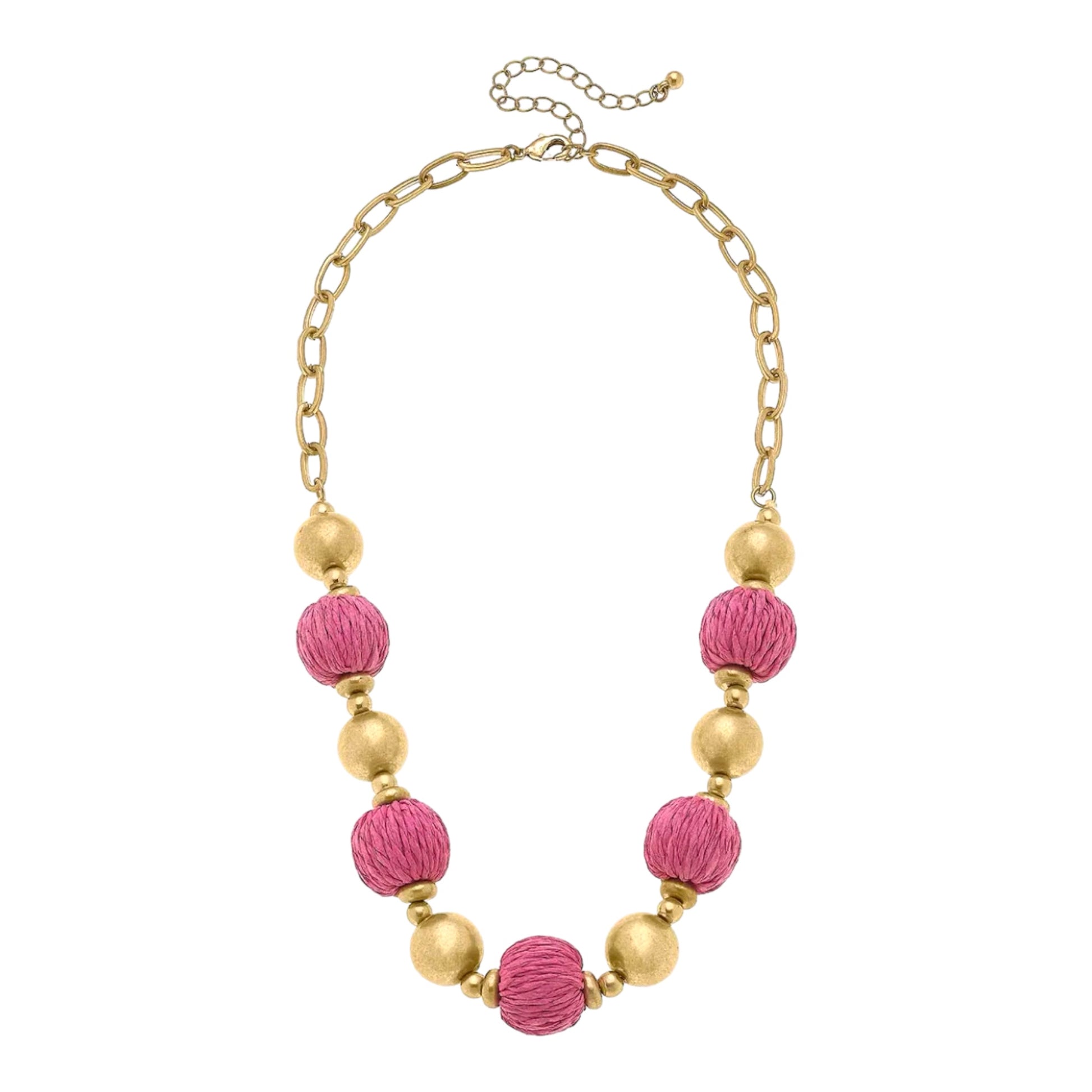 Unleash your inner island goddess with The Barbados Raffia Necklace! Crafted with delicate pink raffia and gold ball beads, this necklace is the perfect accessory to add a touch of tropical elegance to any outfit. Make a statement and channel the beauty of Barbados with this stunning piece.