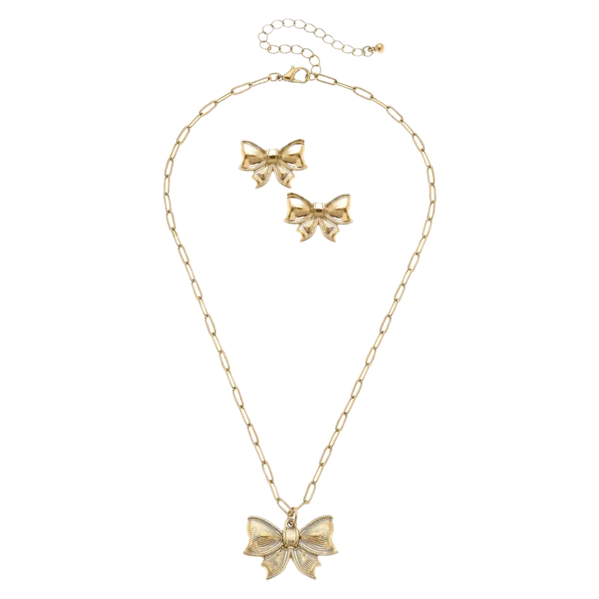 Transform any outfit into a chic and sophisticated ensemble with The Bow Earring And Necklace Set. Crafted in beautiful worn gold, this set adds a touch of elegance to any look. Perfect for any occasion, this set is sure to make a statement and enhance your unique style.