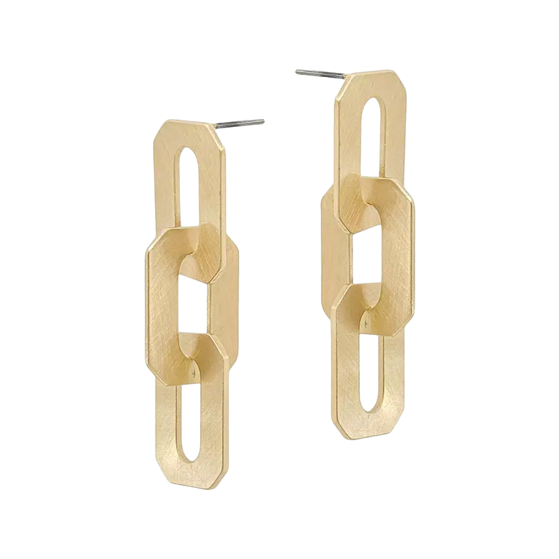 Elevate any outfit with The Brushed Gold Link Earring! Made with high-quality materials, these earrings are a statement piece that adds a touch of elegance and sophistication. The beautiful brush gold finish adds a luxurious and eye-catching touch. Make a bold statement with The Brushed Gold Link Earring!