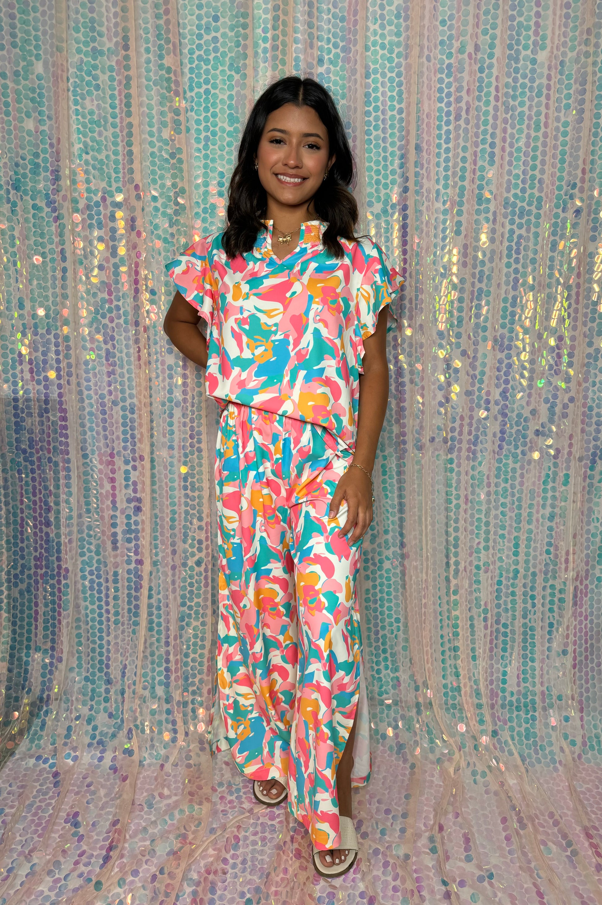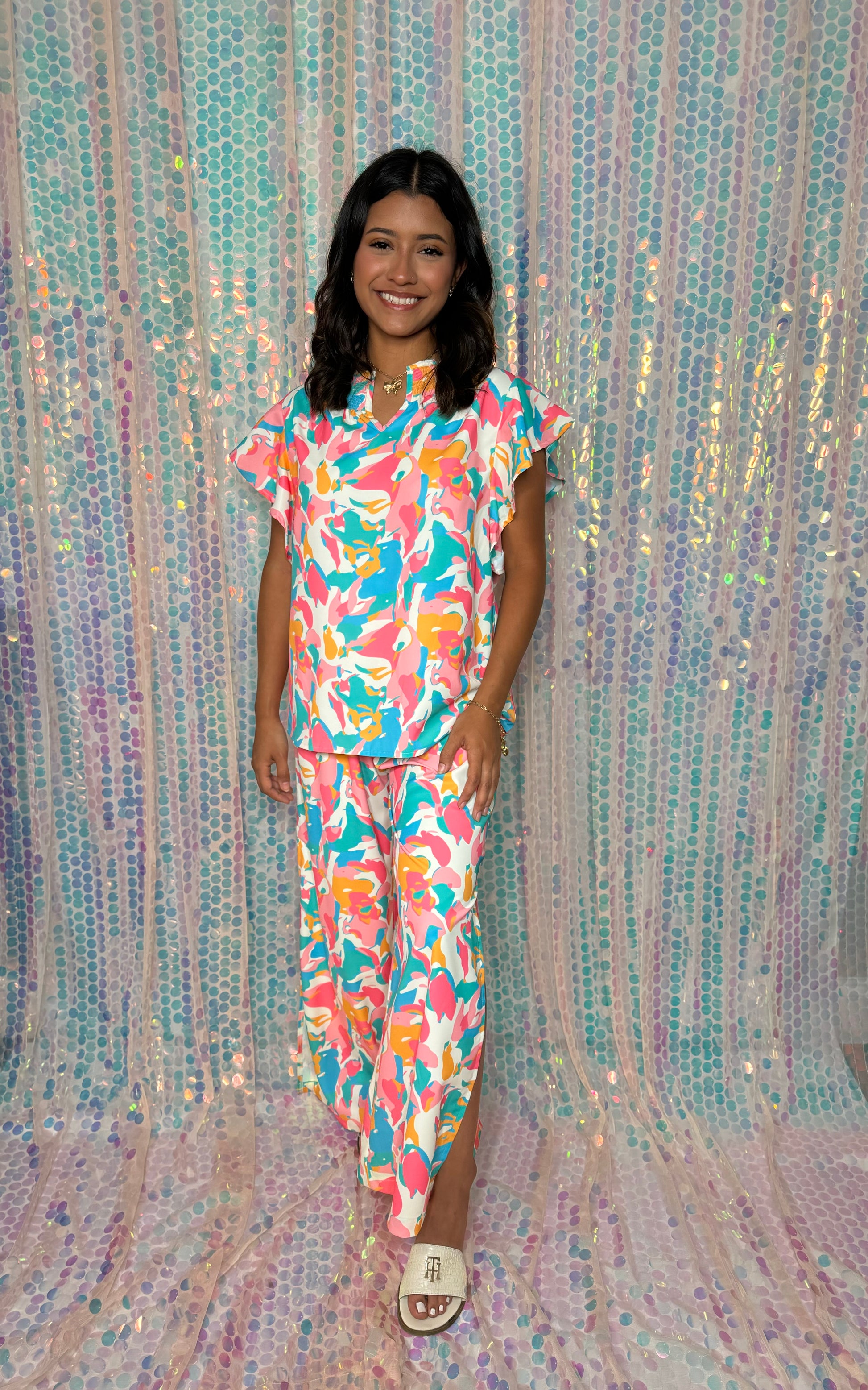 Add a pop of color to your summer wardrobe with our Colorful Ruffled Sleeve Top And Wide Leg Pants Set. Perfect for any outing, the flowy pants with side slits provide a fresh and fun look. Get ready to turn heads with this playful and vibrant set!