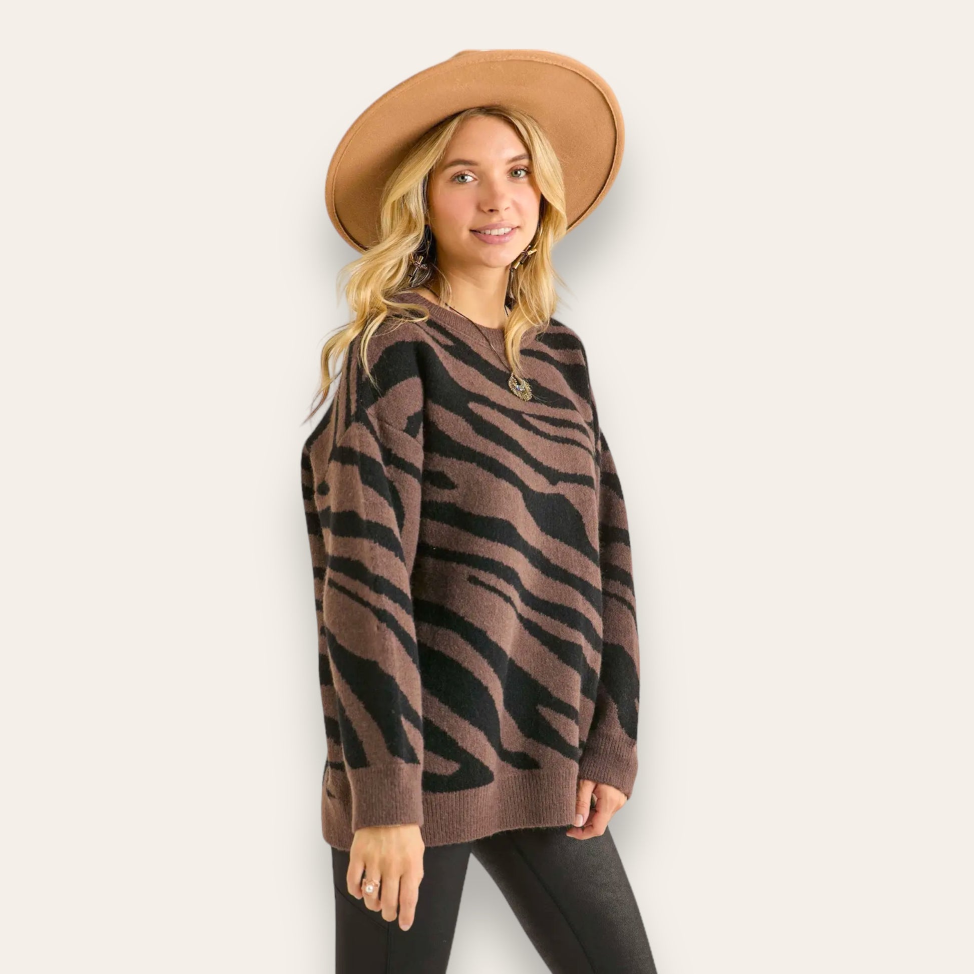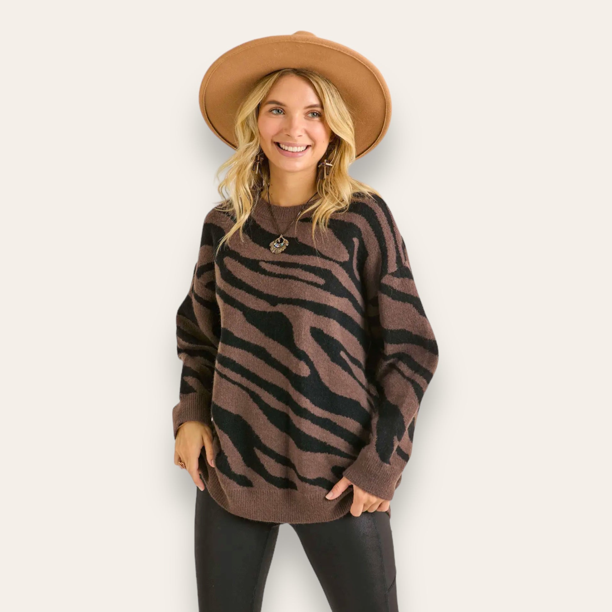 Wrap yourself in luxurious warmth with The Cozy Chocolate Zebra Sweater! This eye-catching sweater features a striking zebra print and is made from soft and comfortable fabric that will keep you warm on cold winter days. What are you waiting for? Choose comfort and style and say hello to the cooler weather with this amazing sweater!