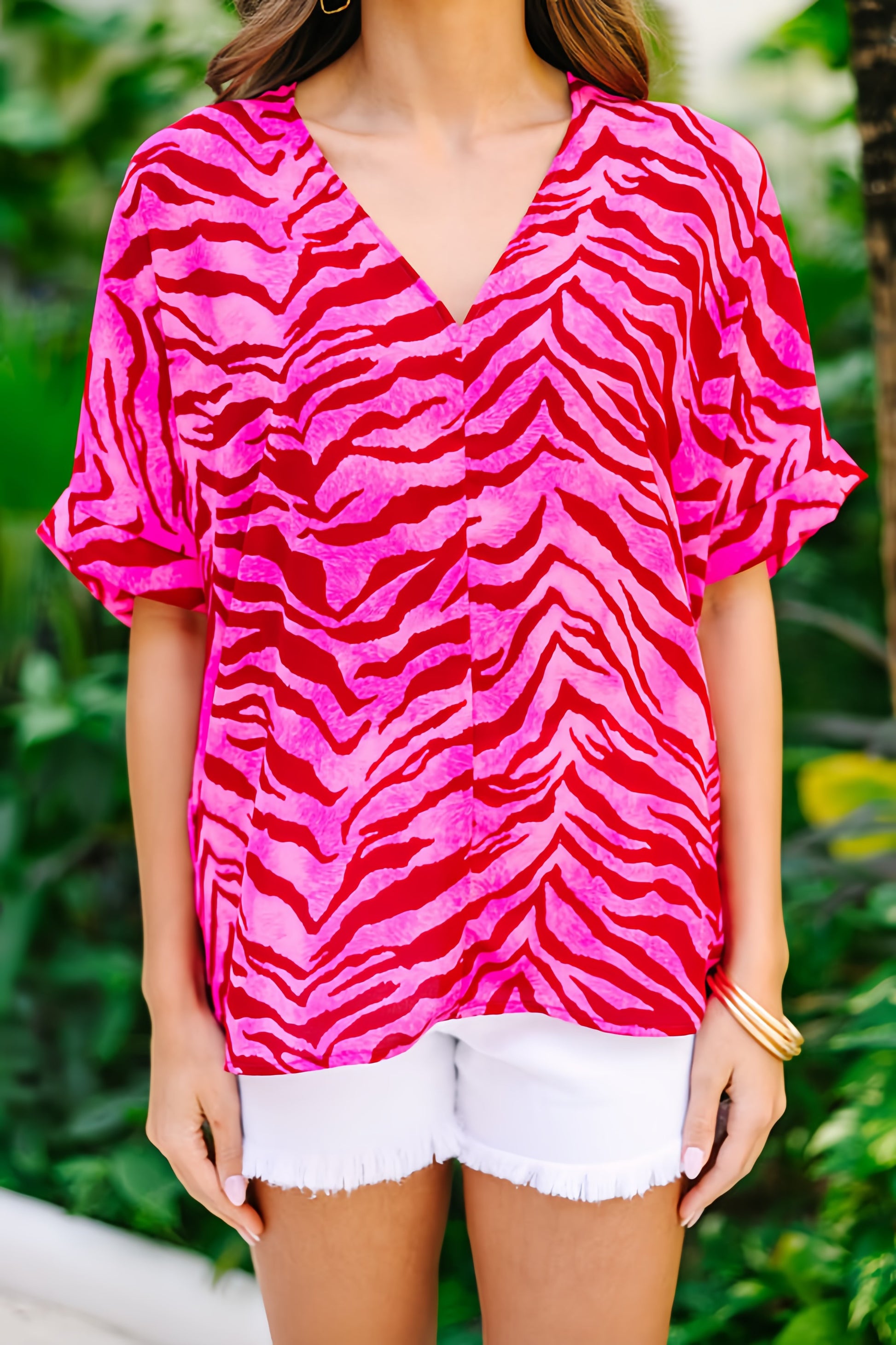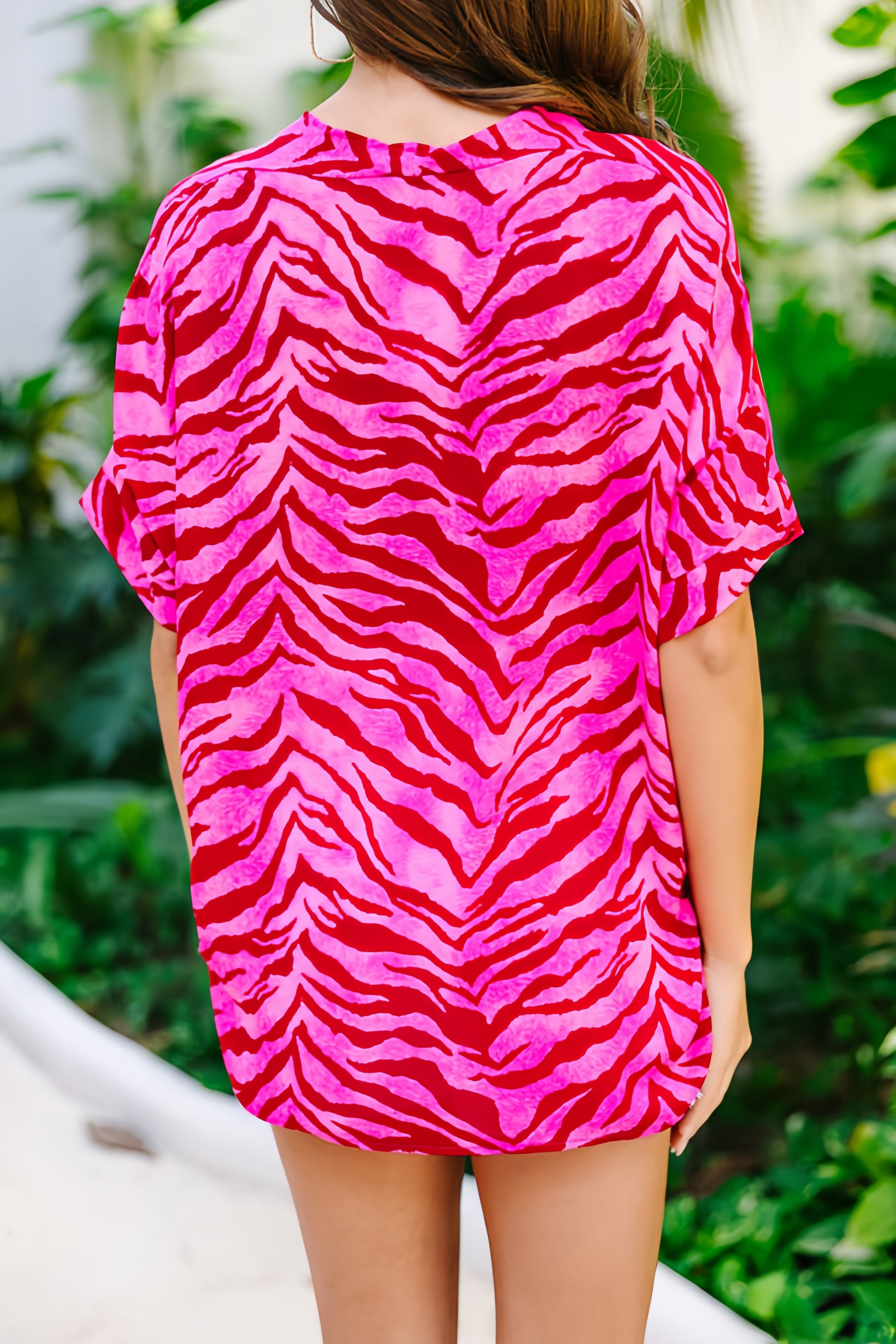 Unleash your wild side with The Jungle Paradise Top! Featuring a bold zebra print in vibrant red and pink, this fashionably oversized top will elevate any outfit. Stand out from the crowd and embrace your unique and fierce style with this must-have piece.