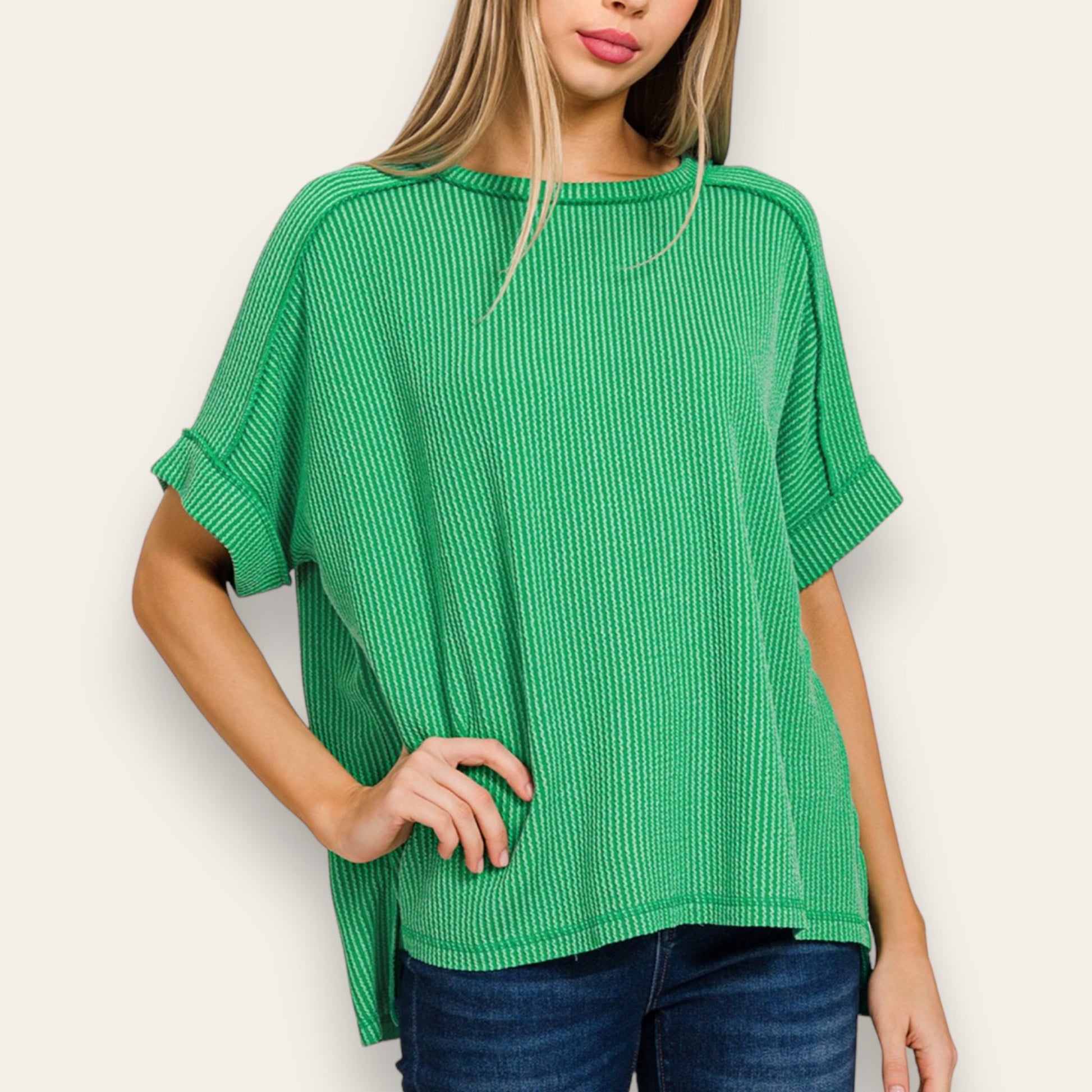 Introducing The Kali Textured Top in vibrant kelly green. Experience both comfort and style with this eye-catching top. The unique texture adds a touch of elegance while the color brings energy to any outfit. Elevate your wardrobe with this must-have piece!