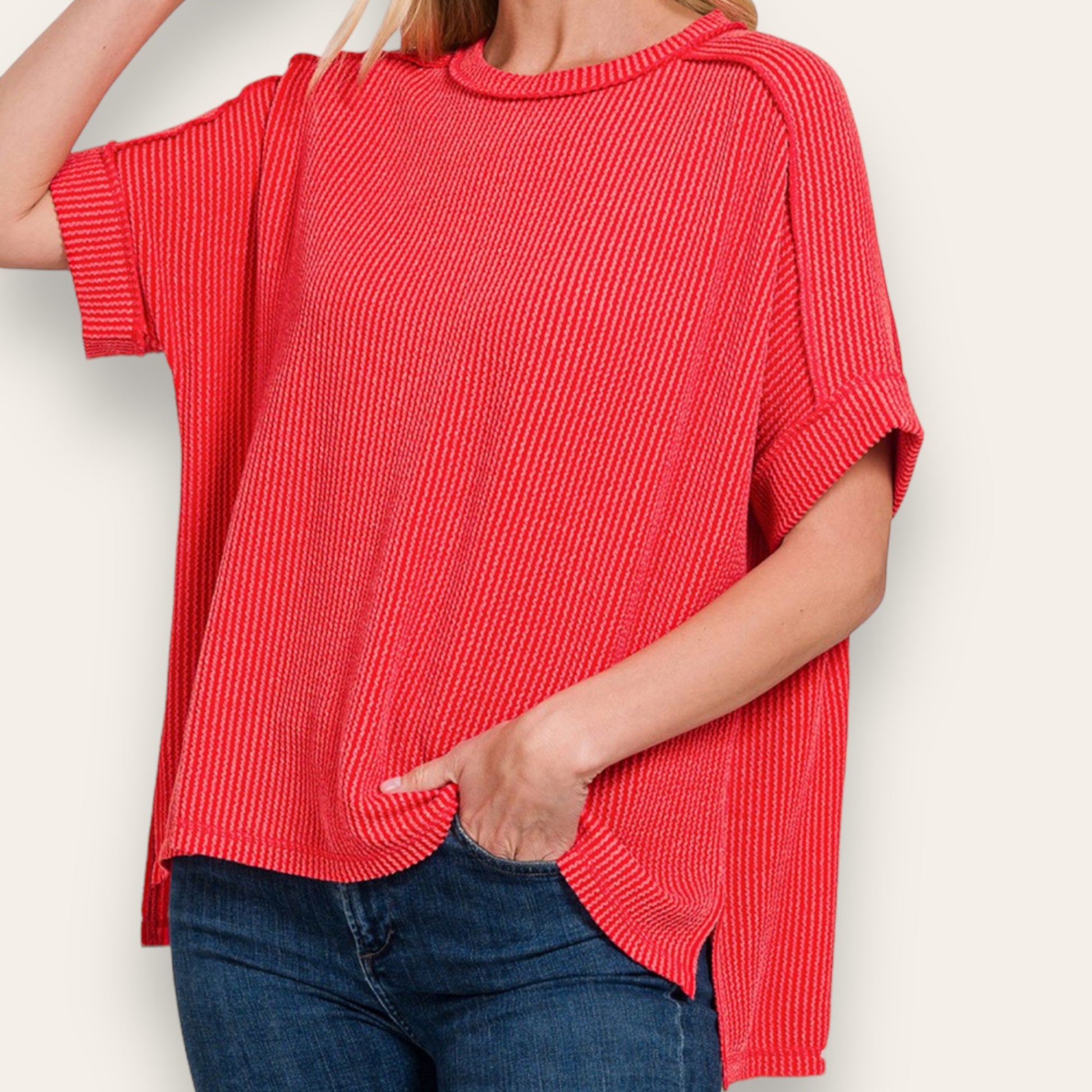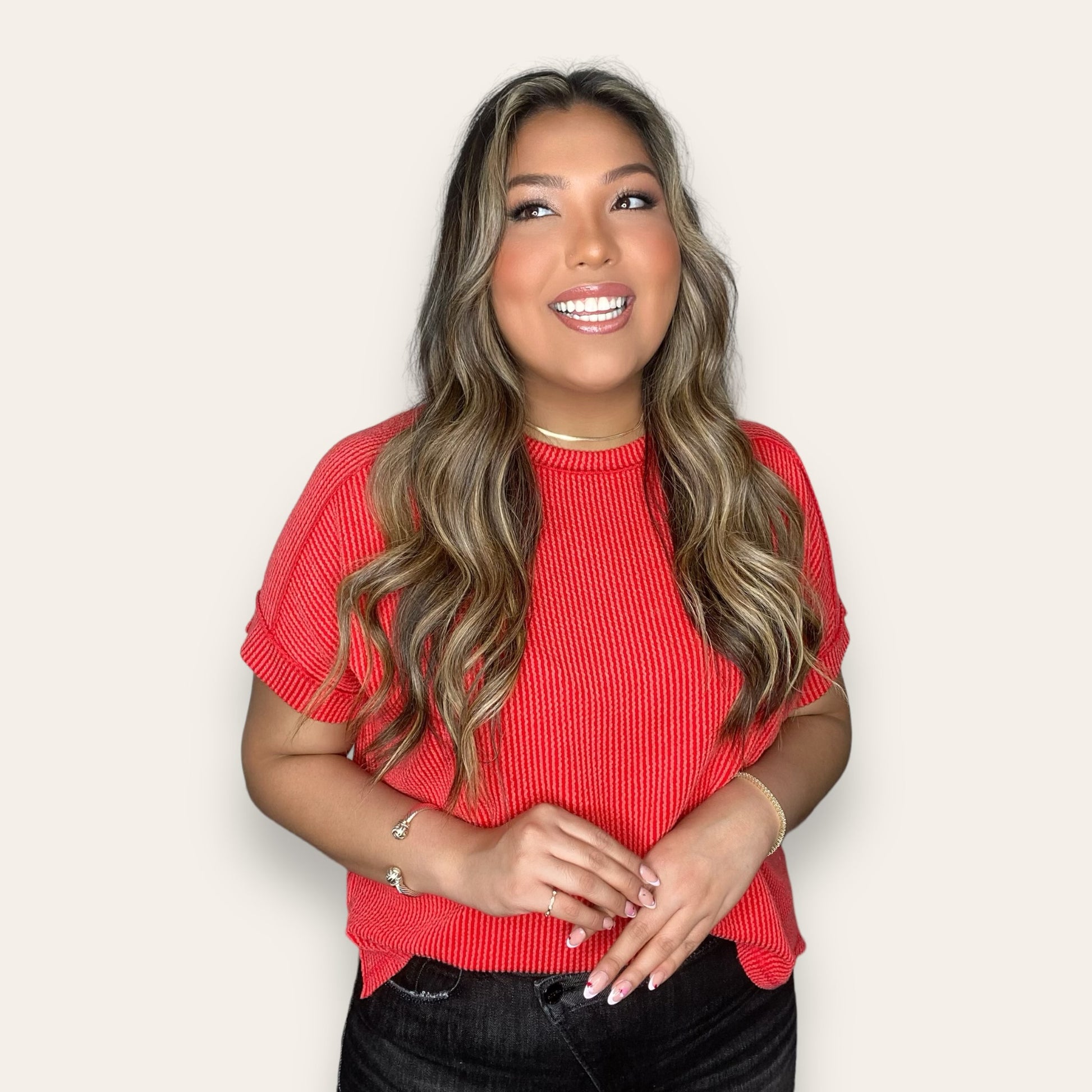 Introducing The Kali Textured Top in Red - a versatile and stylish addition to your wardrobe! This top features a unique textured fabric that adds visual interest and a flattering fit. Perfect for any occasion, dress it up or down for effortless style!