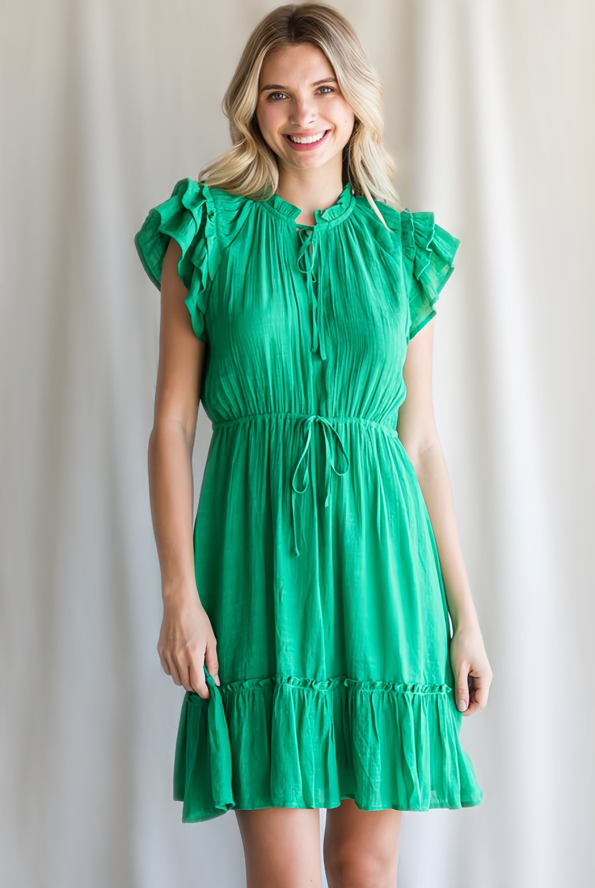 Turn heads in this stunning Kelly Green Ruffled Sleeve Dress. The bold color and playful ruffled sleeves make a statement, while the lightweight fabric and flattering cut provide comfort and style. Perfect for any occasion, this dress is a must-have in your wardrobe.
