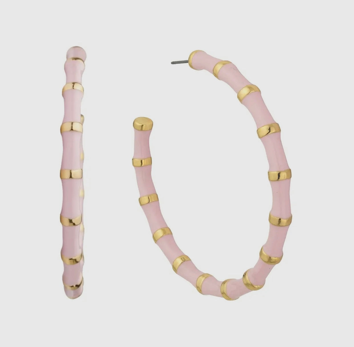 Add a touch of fun and femininity to your jewelry collection with our Light Pink Large Bamboo Hoops! These earrings feature a beautiful shade of baby pink and are made of lightweight and quality material. Perfect for day or night, these hoops are sure to elevate any outfit and make a statement!