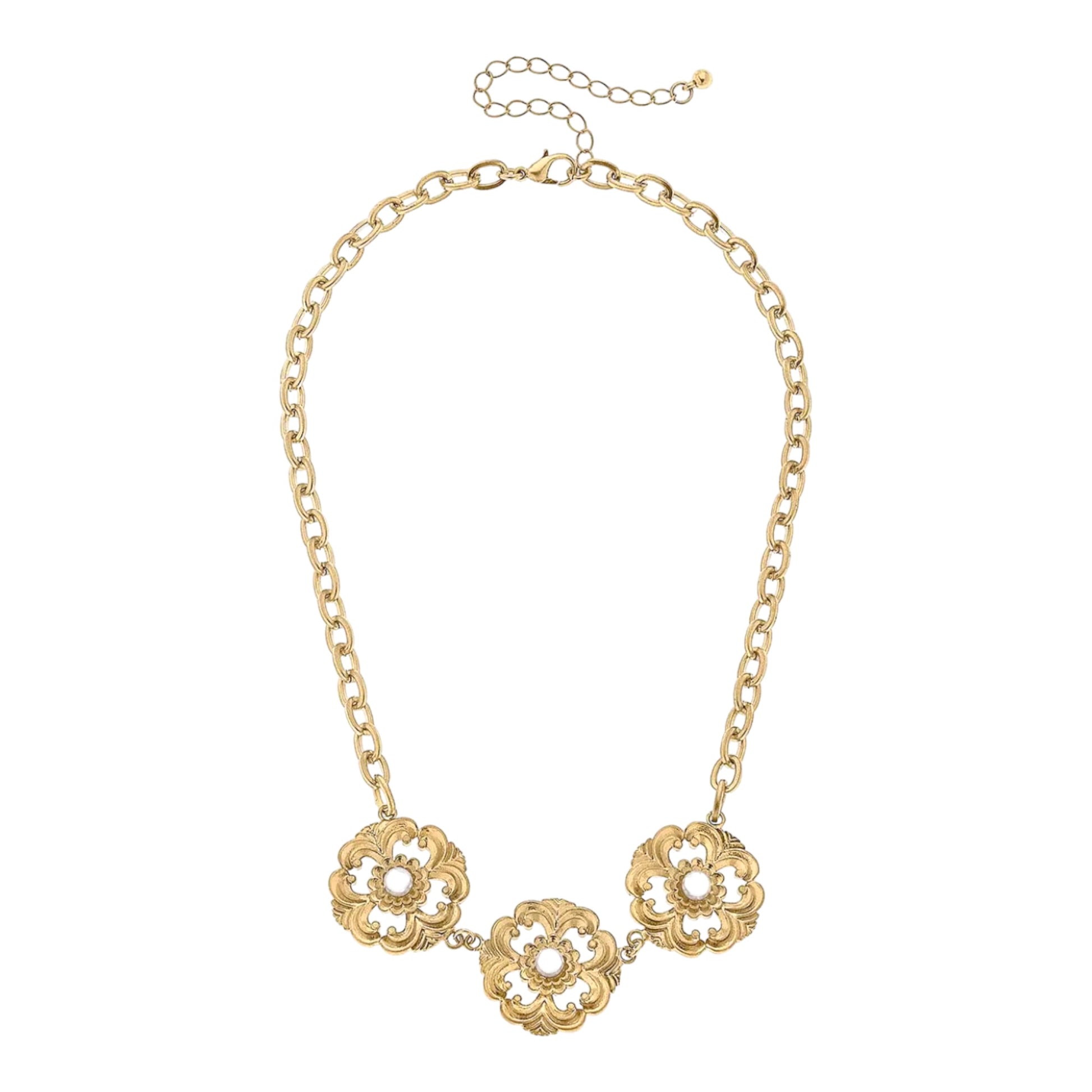 Introducing the stunning Linked Marguerite Acanthus & Pearl Necklace in worn gold! This elegant piece is a must-have for any jewelry collection, adding a touch of sophistication and luxury to any outfit. Perfect for special occasions or everyday wear, it's a timeless accessory that will never go out of style. Order now and elevate your jewelry game!