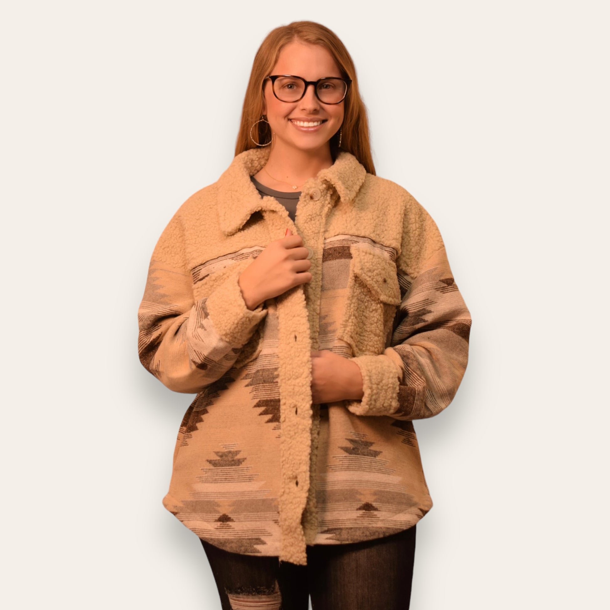 This Aztec Oversize Sherpa Shacket is the perfect cozy addition to your winter wardrobe. Its mocha mix aztec pattern is stylish and timeless, sure to keep you warm. With a soft and warm interior, this shacket is perfect for cold days. Look and feel your best in this modern classic!