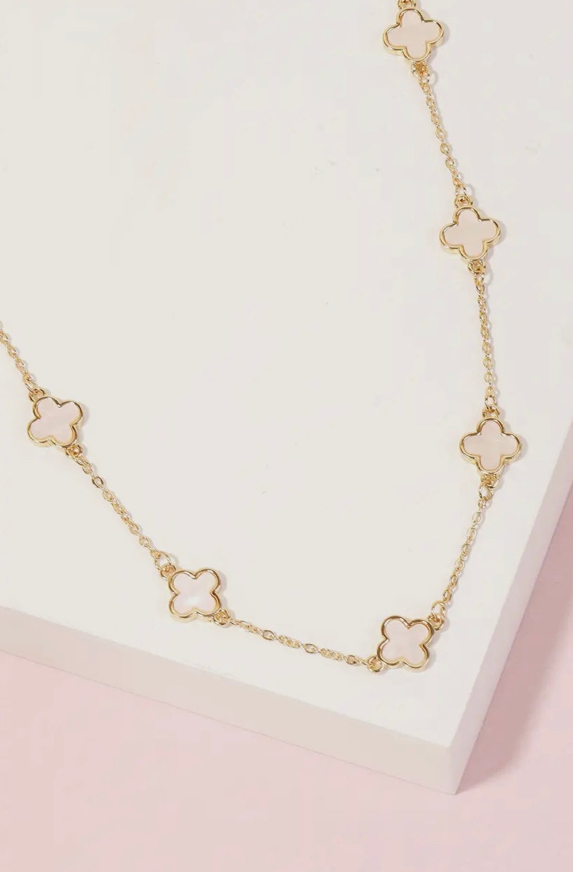Add a touch of elegance to your outfit with The Mother Of Pearl Clover Necklace. The beautiful mother of pearl clover pendant adds a feminine and sophisticated touch to any look. Made with high-quality materials, this necklace is sure to become a staple in your jewelry collection.