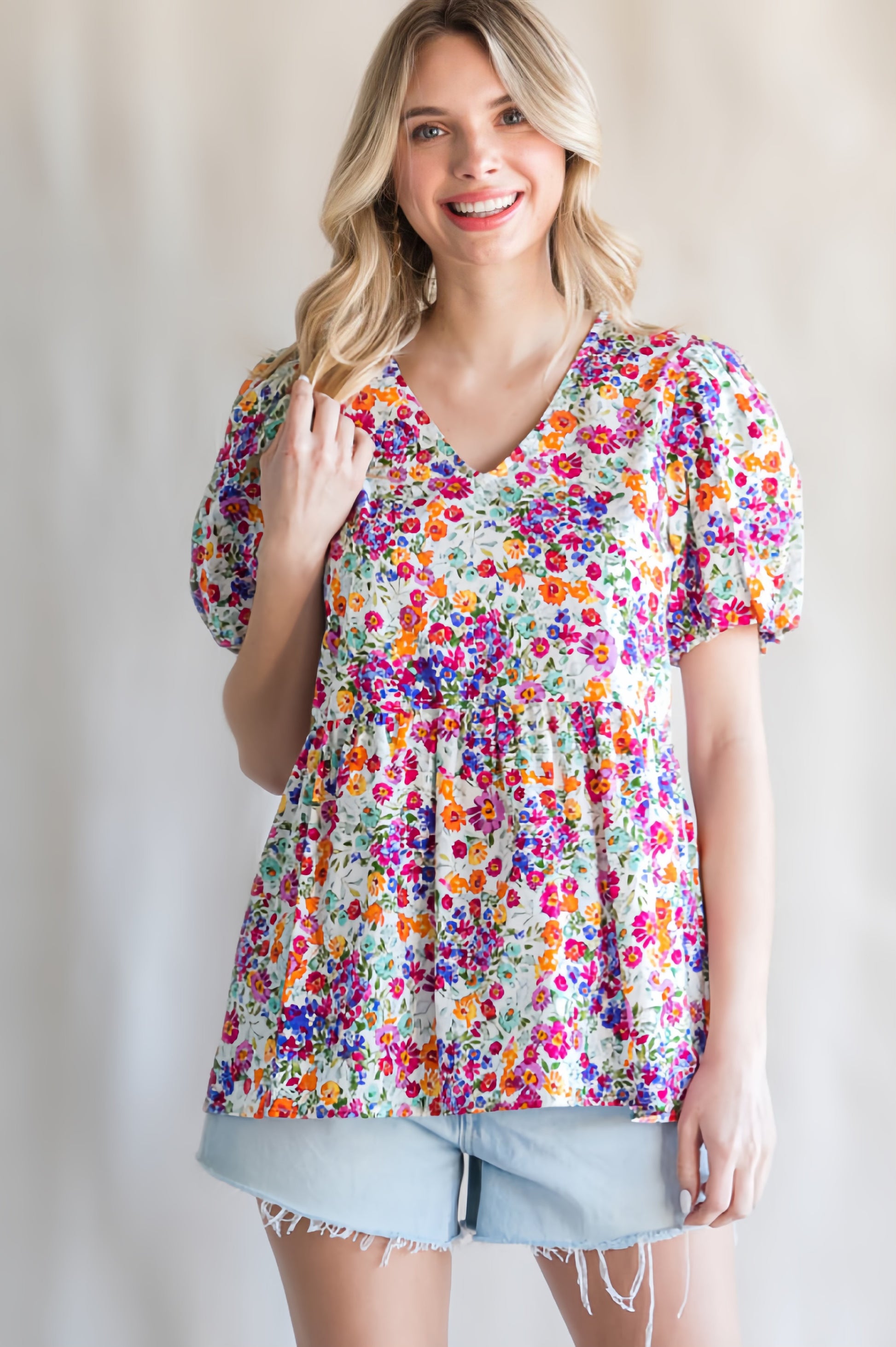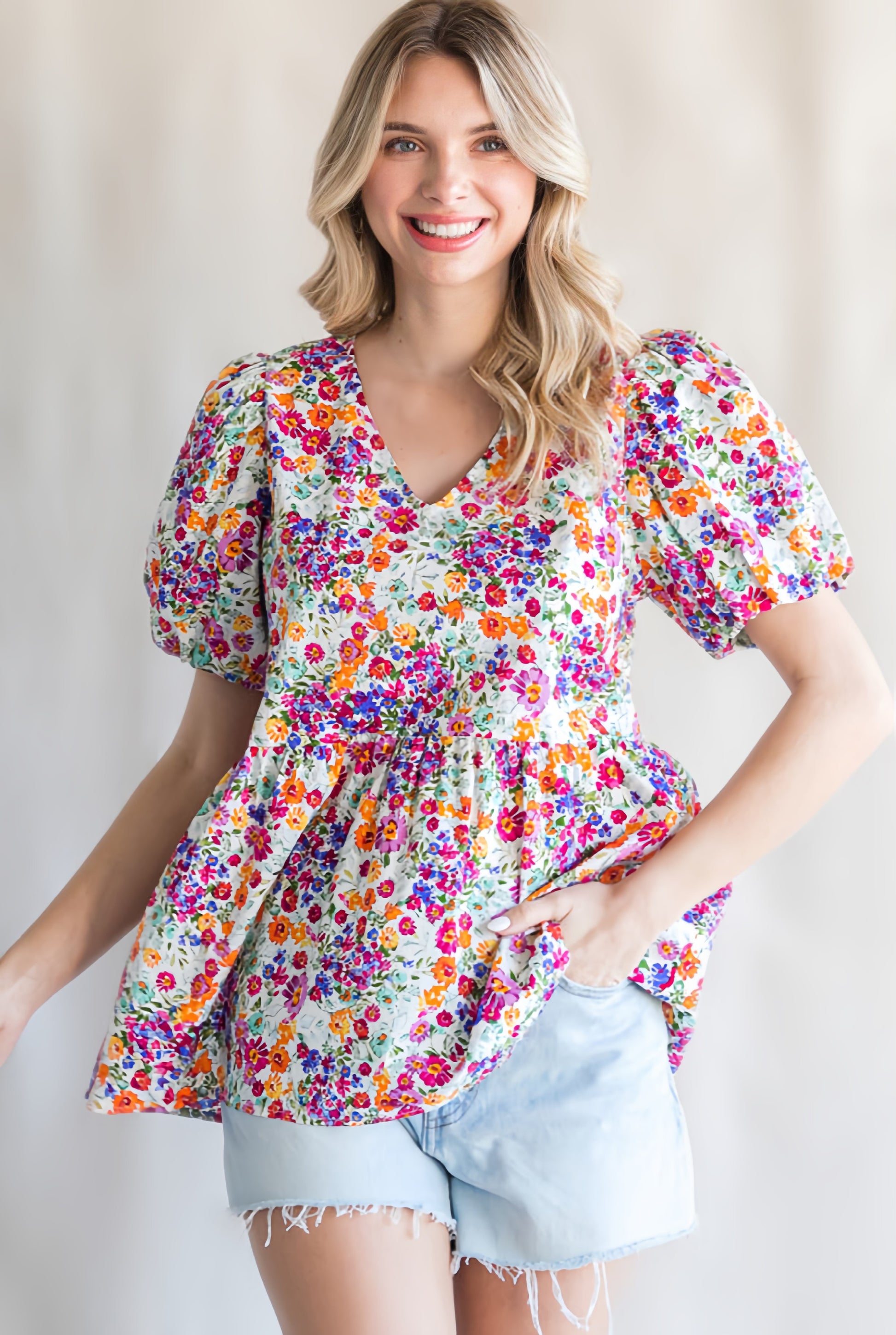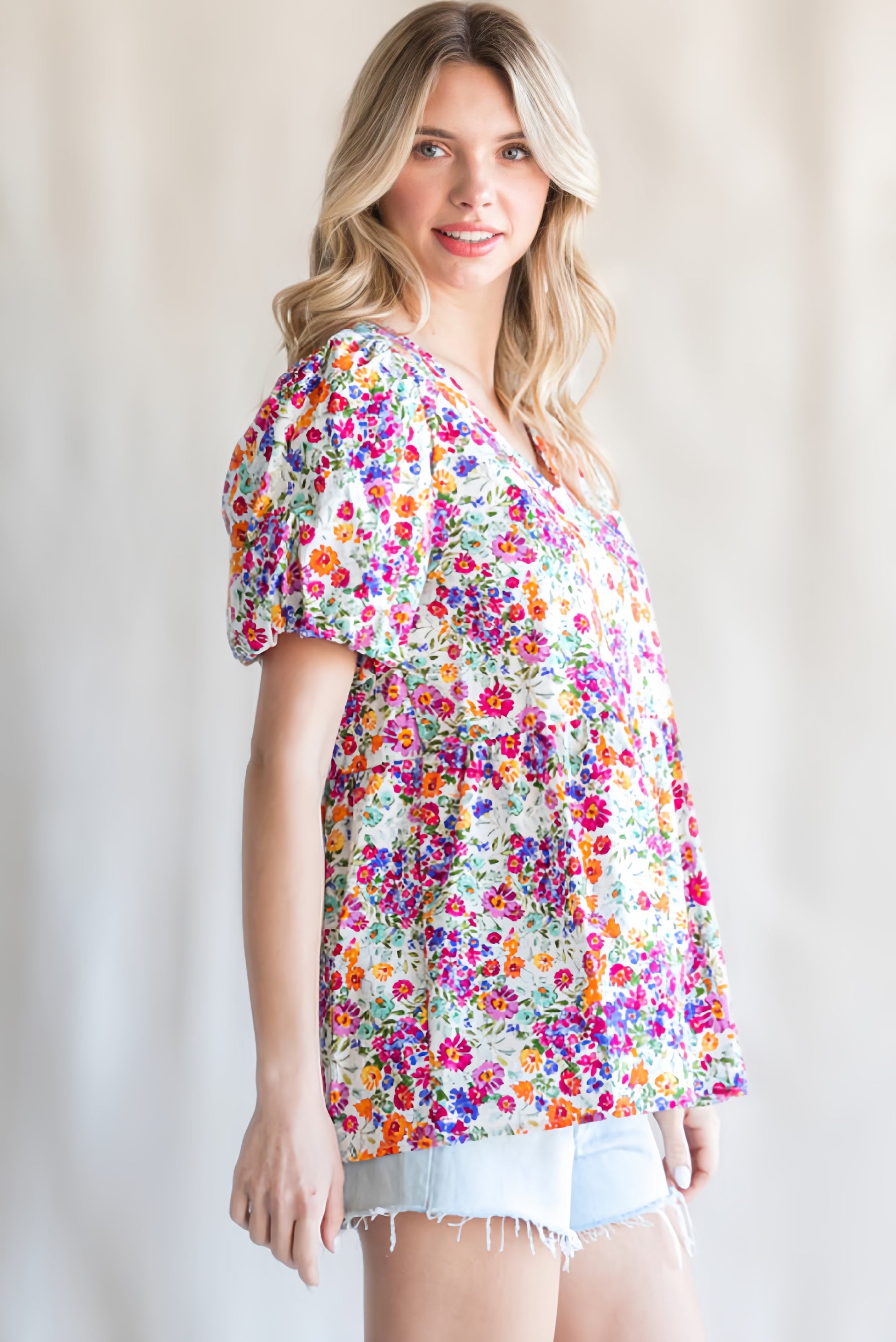 Introducing the Multicolor Floral Top, the must have piece for this warm weather! Featuring vibrant floral patterns and trendy bubble sleeves, this top will keep you stylish and comfortable. Say hello to your new go-to for any occasion!