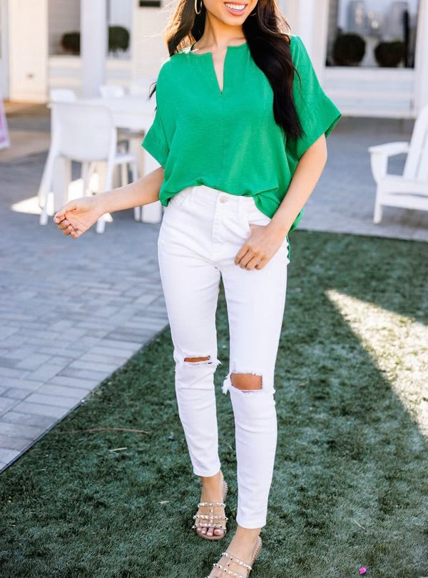 Experience effortless style and comfort with The Sienna Split Neck Top! This stunning short sleeve top in kelly green is the perfect addition to your wardrobe. With its split neck design and charming color, you'll look and feel gorgeous all day long. Elevate your fashion game with The Sienna Split Neck Top.