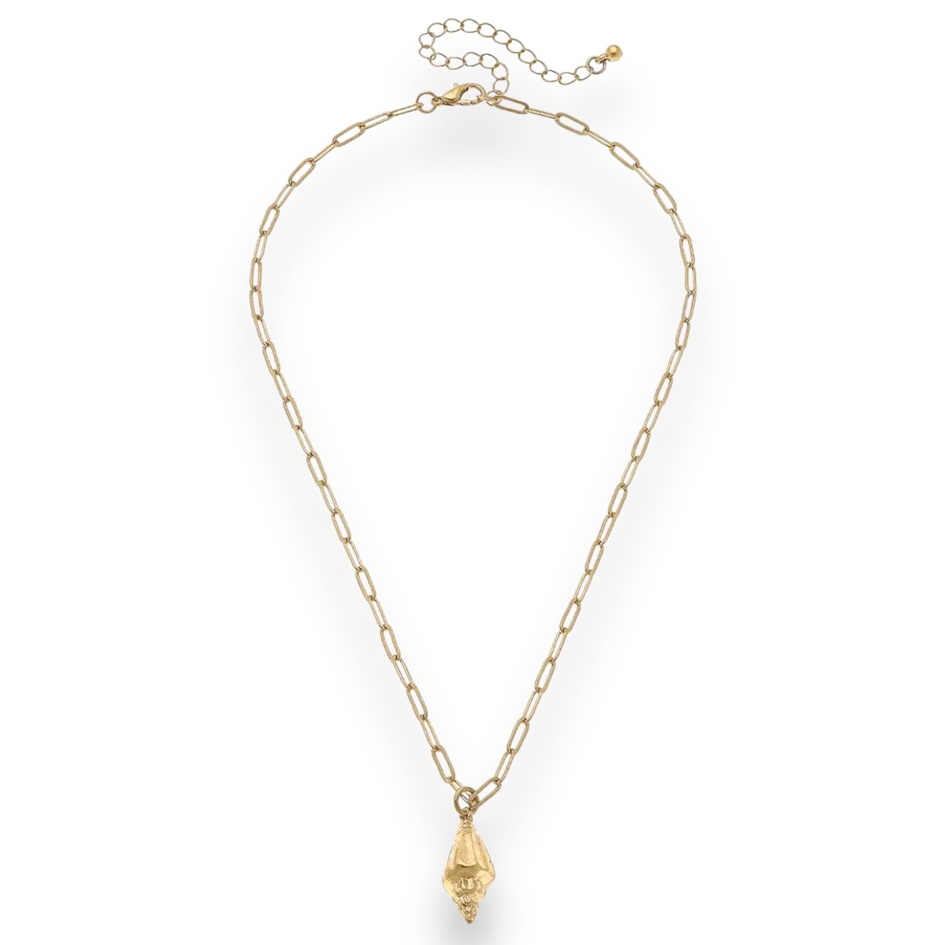 Make a statement with our Spiral Shell Necklace! Crafted in a beautiful worn gold, this necklace features a unique spiral shell design, adding a touch of elegance to any outfit. Stand out and let your inner beauty shine with this must-have accessory!