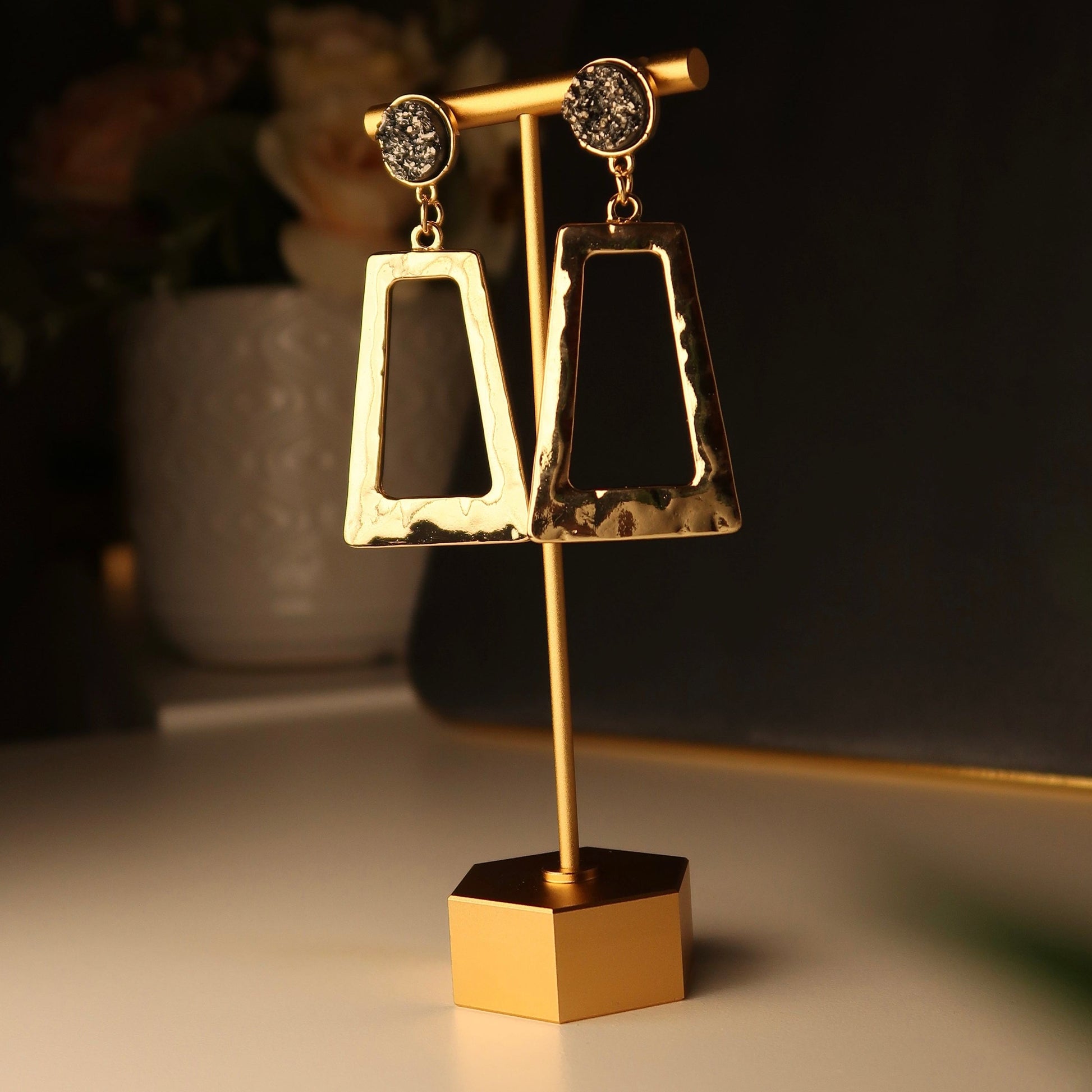 Enhance your style with The Viviana Drop Earring. These elegant earrings feature a silver-grey rectangle design encased in stunning gold. Perfect for adding a touch of sophistication to any outfit. Elevate your look and stand out from the crowd with these statement earrings!