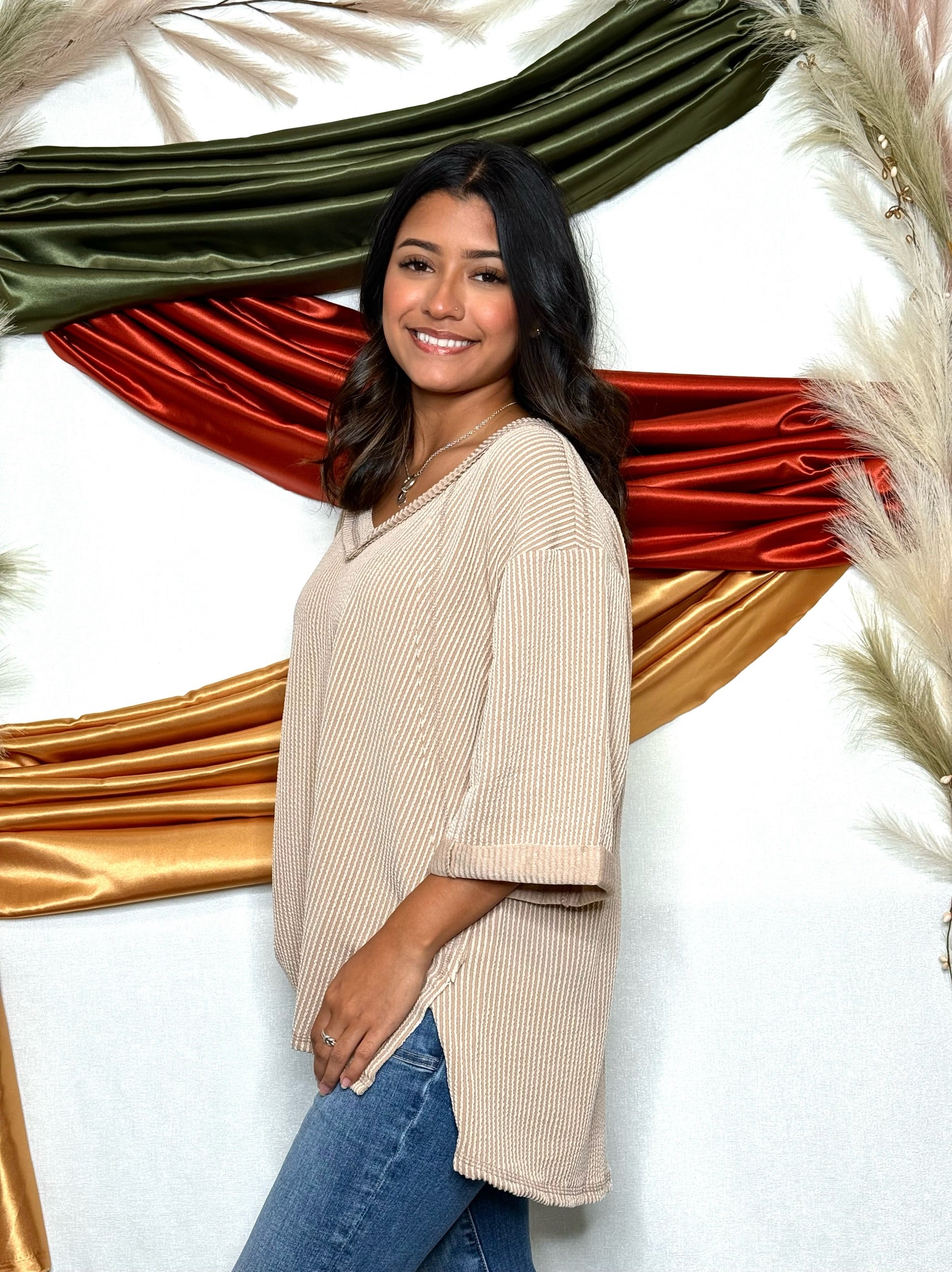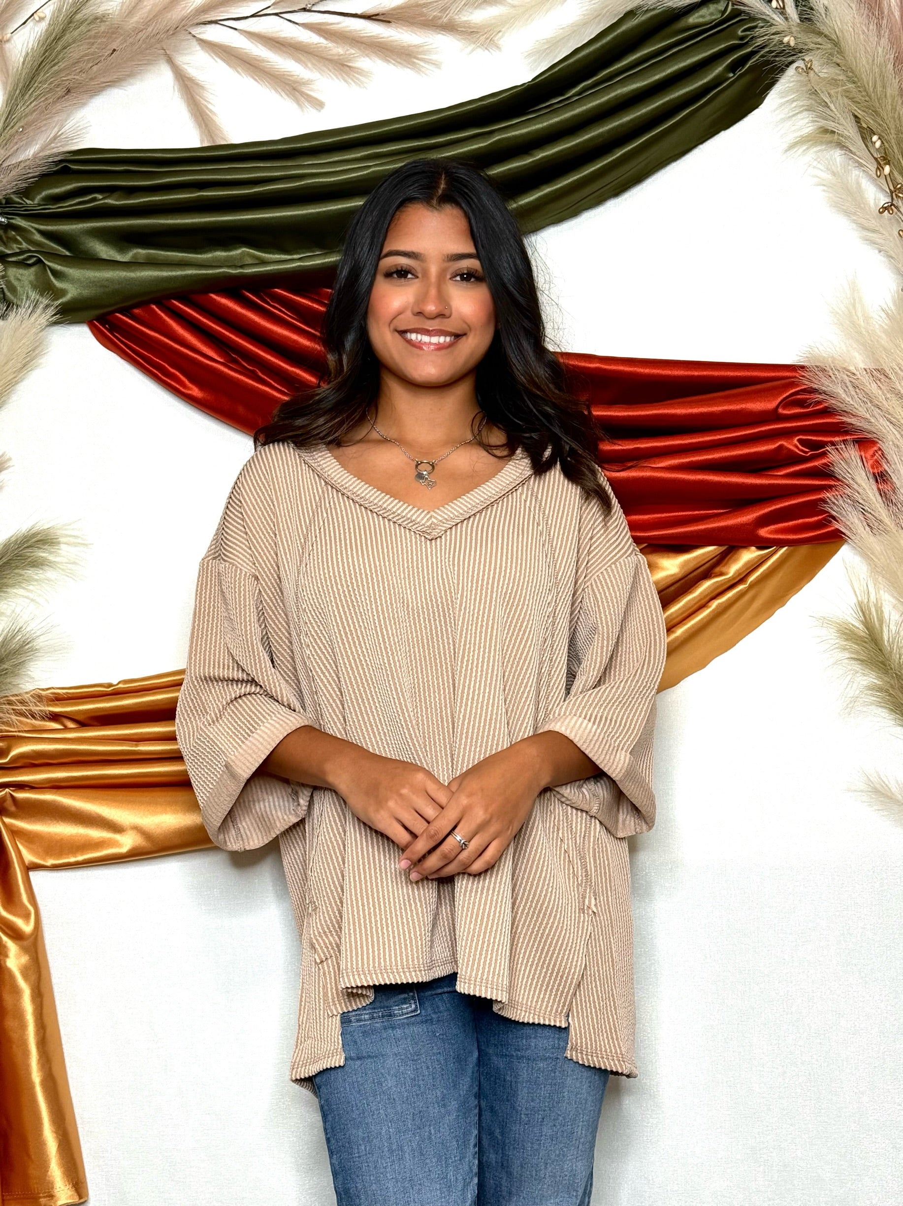 Elevate your wardrobe with the Urban Ribbed Top. Its unique texture and v neck design make it a versatile piece for any occasion. Dress it up with jeans or dress it down with leggings for a stylish and comfortable look. Perfect for the fall season!
